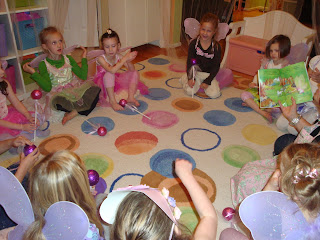 Like always, I like the decorating, but the fairies loved the activities. We began by putting sparkly make-up on each Fairy as she arrived. Then they were sent off to decorate their Fairy Treasure box (later used as their take home "baggie").